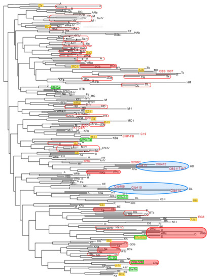 Clustering of 233 Lebanese and 19 non-Lebanese isolates according to interdelta fingerprinting. Lebanese isolates are indicated by the initials of their corresponding wineries. Redundant isolates from the same vats or wineries are not represented. Wineries names are indicated by capital letters representing the initials of the village (e.g., HA). When several wineries are examined per village, uppercase letters are followed by lowercase letters (e.g., HAa, HAb). Most of the isolates were sampled in year III unless otherwise indicated by I, II or IV at the end of the isolate name. Non-Lebanese isolates are in red. Red non-filled and red-filled rectangles correspond respectively to highly similar isolates from the same winery, or from wineries of the same village. Yellow and green filled rectangles correspond respectively to isolates taken from sweet wines or identical isolates from different wineries. Blue ovals highlight two clusters of non-oenological isolates.