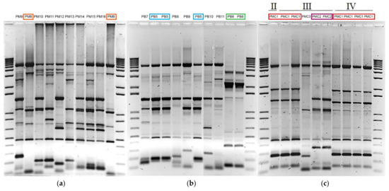 During years III and IV, and in the cases where only a single vat was sampled per winery, 10 or 9 isolates were studied from one vat (while numbers below nine were not considered during analysis, like for winery WKa/year III, which was not taken into account due to only having four isolates—Table S1). A diversity of profiles was observed between isolates of the same vat (where the number of different patterns varied between 0 and 100%, with a mean of 76.33% different patterns per vat) but similar patterns were nonetheless observed repeatedly (Figure 2a,b). One or two patterns were found more frequently than the others in 11 out of 12 such vats analysed (Table S1). These “dominant” isolates represented at least 20 or 30% of the sampled population of a single vat. Three of them represented 40 to 50%, and two, 80 and 100% of the sample (Table S1). Though these proportions (and those that will follow) have to be taken with caution, since the sampled population per vat/winery was small, they nonetheless give an idea about the existence of frequent or stable strains. We will therefore refer to the frequent strains as “dominant” for convenience.