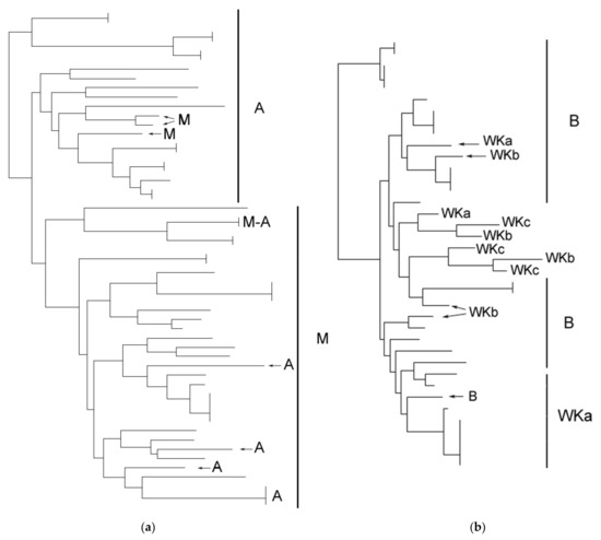 Interdelta clustering of isolates from geographically close wineries: (a) wineries A and M; (b) winery B and 3 wineries from village WK (WKa, WKb and WKc). Only the provenance of the isolates is indicated on the figure.