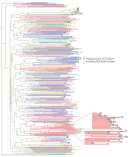 The only other observed large cluster was of 15 strains originating from Alsace. However, unlike the Lebanese isolates, these Alsatian strains all originated from a narrow geographical area, with nine of them being from the same winery (W4, Table S3), and they were all related to the commercial strain EG8, initially isolated from Alsace. These observations according to microsatellites typing suggest that the Lebanese flora, though diverse, is interrelated in comparison to worldwide floras.