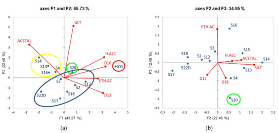 Glycerol (57.26% contribution to axis F2) is the most abundant compound obtained by fermentation, after ethanol and CO2. It plays an important role in wine structure as it gives body and roundness while alleviating harshness and astringency. It is generally produced at concentrations between 5 and 8 g/L [63,71,73]. Our strains fall within these values, the lowest being of 4.75 g/L (S17) (excluding the two strains, S1 and S11, that did not finish the fermentations) and the highest (S14) being close to 8 g/L.