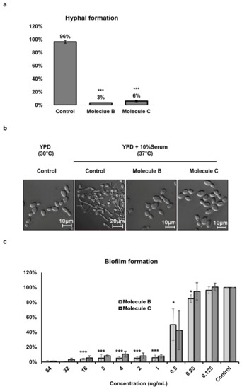 Figure 2. Inhibitory effect of Molecule B and Molecule C on morphogenesis and biofilm formation in C. albicans. (a) The inhibitory effects of Molecule B and Molecule C on the hyphal formation of C. albicans SC5314. To induce hyphae formation, YPD with 10% FBS was used and incubated for 2 h at 37 °C. Molecule B was treated at 8 μg/mL, and Molecule C was treated at 16 μg/mL. (b) A minimum of 300 C. albicans SC5314 cells were counted for each treatment to evaluate the morphogenesis inhibitory effect as a percentage. To observe the morphology change using a microscope, Molecule B and Molecule C were administered at each MIC. Scale bars represent 10 μm (yeast form) and 20 μm (hyphae). (c) The inhibitory effect of Molecule B and Molecule C on C. albicans biofilm formation. Biofilms were formed by inoculation 2 × 104 C. albicans SC5314 cells/mL in 200 µL cell suspension into 96-well flat-bottomed microtiter plates adding Molecule B and Molecule C to final concentrations ranging between 0.125 and 64 µg/mL and incubating at 37 °C for 24 h. A metabolic assay based on the reduction of XTT was performed to determine the biofilm formation inhibitory concentrations. Colorimetric absorbance was measured at 495 nm in a microtiter plate reader. Each experiment was conducted in triplicate. The data represent the mean and standard deviation of three independent experiments. * p < 0.05, *** p < 0.001 (t-test).