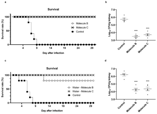 Figure 3. Attenuation of C. albicans pathogenicity by Molecule B and Molecule C treatment in the candidiasis murine model. The candidiasis mouse model was established by the inoculation of 5 × 106 cells of C. albicans SC5314 through tail vein injection. (a) From the day after C. albicans infection to the 30th day, Molecule B and Molecule C were injected at 8 and 16 mg/kg, respectively, via tail vein injection, and the survival rate was measured every day. (b) The dead mice were dissected, the kidneys were harvested, weighed, washed with PBS, chopped, spread on YPD plates, and incubated at 30 °C for 2 days, and then the CFUs were counted to analyze the burden of fungal infection. Each Log10 CFU value is indicated by a dot, and the mean and standard error values are indicated by a horizontal line. (c) For 1 month from the day after C. albicans infection, Molecule B and Molecule C were diluted to 8 and 16 mg/L, respectively, in the drinking water of the mice, and the survival rate was measured every day after allowing the mice to ingest autonomously. (d) The dead mice were dissected, the kidneys were harvested, weighed, washed with PBS, chopped, spread on YPD plates, and incubated at 30 °C for 2 days, and the CFUs were counted to analyze the fungal infection burden. Each Log10 CFU value is indicated by a dot, and the mean and standard error values are indicated by a horizontal line. *** p < 0.001 (t-test).