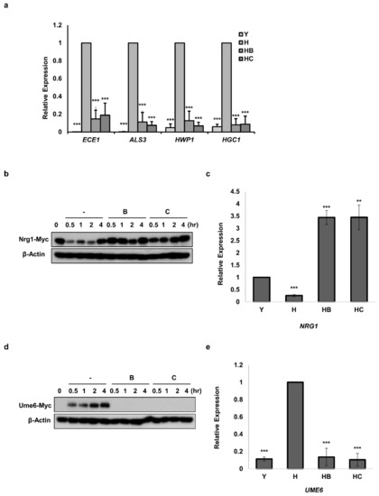 Figure 4. Effects of Molecule B and Molecule C on the expression of HSG, Ume6, and Nrg1 genes. (a) Realtime PCR for comparison of HSGs expression 2 h after hyphae induction. Used strain: BWP17. Y, yeast cells; H, hyphae induced cells; HB, hyphae induced cells with Molecule B treatment (8 μg/mL); HC, hyphae induced cells with Molecule C treatment (16 μg/mL). (b) Changes in the protein levels of Nrg1 after inducing hyphal formation (0–4 h). Used strain: Nrg1-myc. B, hyphae induced cells with Molecule B treatment of 8 μg/mL; C, hyphae induced cells with Molecule C treatment of 16 μg/mL. (c) Realtime PCR for comparison of NRG1 expression 2 h after hyphae induction. Used strain: Nrg1-myc. Y, yeast cells; H, hyphae induced cells; HB, hyphae induced cells with Molecule B treatment (8 μg/mL); HC, hyphae induced cells with Molecule C treatment (16 μg/mL). (d) Changes in protein levels of Ume6 after inducing hyphal formation (0–4 h). Used strain: Ume6-myc. B, hyphae induced cells with Molecule B treatment (8 μg/mL); C, hyphae induced cells with Molecule C treatment (16 μg/mL). (e) Realtime PCR for the comparison of UME6 expression 2 h after hyphal formation induction. Used strain: Ume6-myc. Y, yeast cell; H, hyphae induced cells; HB, hyphae induced cells with Molecule B treatment (8 μg/mL); HC, hyphae induced cells with Molecule C treatment (16 μg/mL). Western blotting was performed with an anti-myc antibody to detect Nrg1-myc and Ume6-myc. In western blotting, β-actin was used as a loading control by detection using the anti-β-actin antibody. Each experiment was conducted in triplicate. The data represent the mean and standard deviation of three independent experiments. ** p < 0.01, *** p < 0.001 (t-test).