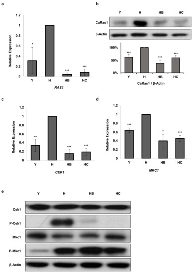 Figure 5. mRNA and protein expression levels of RAS1 and mRNA expression levels of MAPK were reduced by Molecule B and Molecule C treatments. However, the level of P-Mkc1 did not decrease, while that of P-Cek1 did, with these treatments. The BWP17 C. albicans strain was used for western blotting and real-time PCR analyses. (a) Relative mRNA expression levels of RAS1 were determined using real-time PCR. (b) In western blotting, CaRas1 was detected using the anti-Ras10 antibody, and β-actin was used as a loading control. The quantification graph by Image J software was prepared by normalizing the ratio of each CaRas1 blot to each β-actin loading control. The relative mRNA expression levels of CEK1 (c), and MKC1 (d) were determined using real-time PCR. (e) Western blotting was performed by detecting Phospho-Mkc1 and Phospho-Cek1 using an anti-phospho-p44/42 antibody. Mkc1 and Cek1 were detected using the anti-p44/42 antibody, and β-actin was used as a loading control. Y, yeast cells; H, hyphae induced cells; HB, hyphae induced cells treated with 8 μg/mL Molecule B; HC, hyphae induced cells treated with 16 μg/mL Molecule C. Each experiment was conducted in triplicate. The data represent the mean and standard deviation of three independent experiments. * p < 0.05, ** p < 0.01, *** p < 0.001 (t-test).