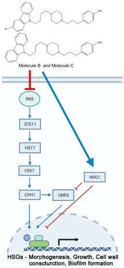 Figure 6. Putative model of virulence inhibition in C. albicans by Molecule B and Molecule C. The inhibitory effects of Molecule B and Molecule C on upstream activator signaling proteins are shown. Molecule B and Molecule C inhibit Ras1 and affect the PAK kinase Cst20, thus affecting the Cek1 MAP kinase cascade, resulting in a decrease in the levels of the transcription factor Cph1. The level of Ume6, which is regulated by the signal of Cph1, also decreases as the amount of Nrg1 increases.