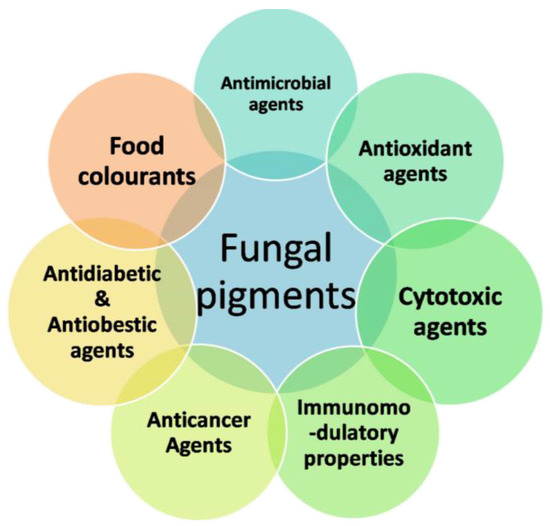 Most fungi produce pigments along with mycotoxins. The presence of mycotoxins in pigments restricts the application of pigments as an additive in the food industry [16,34]. The European Union and the United States prohibit the consumption of Monascus pigments that are produced along with citrinin toxin, which poses a challenge over its safe use [35]. In short, natural pigments are a potential source of colorants that are eco-friendly, biodegradable, antimicrobial and have antioxidant properties. Apart from food additives, they are also used in cosmetics, pharmaceuticals and drug applications [36] (Table 1).