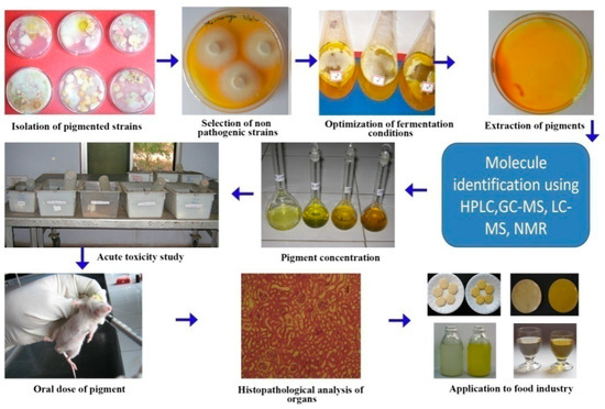 Toxicological studies on the Thermomyces pigment using albino mice that orally ingested Thermomyces sp. pigment for 28 days showed no alterations in red blood cells, white blood cells, haemoglobin, organ weight orhistopathology of the liver or kidneys [54] (Figure 3). Apart from pigmentation, in vivo antioxidant activity was also observed [87,88]. Therefore, pigments from Thermomyces sp. could be safe for the food industry.