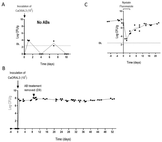 Effect of the antibiotic treatment on CaORAL3 colonization. (A) A suspension of CaORAL3 cells was inoculated in non-antibiotic treated mice. (B) CaORAL3 cells were inoculated in Ab-treated mice 4 days prior plus 9 days after C. albicans inoculation. Colonization rate was followed in time and expressed as Log CFUs per g of stools. (C) Effect of nystatin and fluconazole administration over CaORAL3 colonization rate.