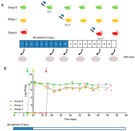 Determination of the minimum antibiotic regimen to allow gut colonization (A) Schematic representation of the assay, three groups of mice were treated with antibiotics for 10 days, 107 CaORAL3 cells were inoculated 3 days before (B), just after (J) or 7 days after (A) the 10-days antibiotic treatment. Stool samples were taken at different time and processed for CFUs count. Data are shown as Log CFU/g of feces (B). Arrows indicate C. albicans inoculation for each group.