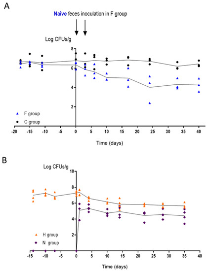 Influence of the microbiota in mice stably colonized with CaORAL3 strain and without antibiotic treatment for 30 days. (A) Feces from naïve mice was inoculated in F group and colonization load was followed in time. Group C was followed as control. (B) Naïve mice (N group) were introduced in the cage of mice previously colonized by CaORAL3 (H group) and colonization load was followed in time. Results of two independent assays are shown in the graph.