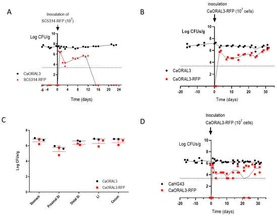 We next determined whether CaORAL3 could impede the colonization of a wild type reference strain. To analyze this, we introduced intra-gastrically an inoculum of 107 RFP-labeled SC5314 yeast cells from an in vitro culture in mice previously colonized by CaORAL3 and where antibiotics were retired 39 days before (Figure 7). As observed in Figure 7A, the SC5314-RFP strain was unable to establish a long-term colonization, although medium fungal loads (104–6) were achieved during the first 10 days. In a parallel control group, CaORAL3-RFP obtained from an in vitro culture was inoculated in mice previously colonized by CaORAL3; the RFP labeled strain also showed lower loads at the beginning, but it ended up reaching roughly the same high colonization loads than already colonizing CaORAL3 (Figure 7B). Post mortem analyses revealed that CaORAL3 and CaORAL3-RFP displayed the same distribution along the gastrointestinal tract, indicating that the strain inoculated in second place was able to compete and occupy the same niche as the previously established strain (Figure 7C). In a separate experiment, we introduced cells of CaORAL3-RFP strain in mice previously colonized by CaHG43 strain where the antibiotics were retired 39 days before (Figure 7D). Again, CaORAL3 was established in the gut indicating that this strain can compete even when other C. albicans strains are already occupying the intestine.