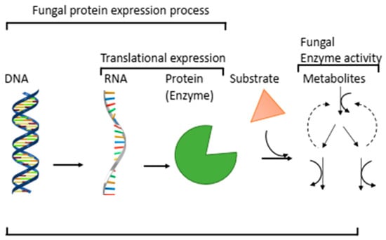 Although the process of obtaining axenic cultures of fungi is tedious and requires several sub-culturing and strain transfers on selective media, it is unavoidable in the quest to derive biological products from a fungal strain []. Moreover, pure plate cultivation ensures storage and reproducibility. In the past, identification was based on observable traits, and characterisation employed morphological variations that relied on nuanced visualisation facilitated by staining techniques and microscopy, for example, light, electron, fluorescence, phase contrast, etc. [,]. Morphological characterisation depends greatly on comparative analysis with previously documented fungal features []. Even with advances in microscopy and the additional computational analyses that have improved its accuracy, morphological characterisation is still considered an imprecise method, especially when applied for differentiating members of the same genus and when, at mycelial stages, distinct features have not developed. The reliance of microscopy on an individual’s expertise further increases biases in identification []. Therefore, beyond phenotype-based identification, genotype studies appear to provide the best option in non-discriminatory characterisation. This review provides a synthesis of information on progress made thus far in integrating the omics approach in fungal investigation and functional characterisation of economically significant enzymes in the hope of bringing attention and encouraging routine use of these frameworks in research to boost the lagging database for fungi-derived biological products. There is a general acceptance that any progress in fungi-derived product upscaling and increased industrial product volumes can only be the result of our clear understanding and elucidation of fungal responses to environmental changes, their molecular expression patterns and mechanisms of metabolite productions and adaptations. Such knowledge will be concomitant to advances in the field of mycology and industrial applications. Moreover, it will be associated with the ease in accessibility and cheap application of enzymes and other protein metabolites employed in industrial and environmental processes. Additionally, the application of these enzymes will potentially reduce effluent production owing to its specificity in chemical reactions, and it will serve as an environmental pollution mitigation strategy. Therefore, it becomes necessary to routinely re-evaluate the status of advances made in fungal characterisation to allow researchers to identify gaps requiring improvements. The omics approach, as will be discussed, encompasses metagenomics, genomics, transcriptomics, and proteomics. Figure 1 presents an overview of the protein (enzyme) expression process and the connection to the omics approach in functional characterisation. Research thus far has been sparse, in which omics technologies have been comprehensively used in the characterisation of novel fungal enzymes. In a recent publication, Oates et al. [] used a multi-omics approach to identify a number of potentially important CAZymes from P. putredinis NO1. A potential industrially relevant extracellular oxidase capable of cleaving β-ether linkages and releasing tricin from monocot lignin was also identified. Brenelli et al. [] used a similar approach to identify multiple redox-active enzymes produced by the marine fungus Peniophora sp. CBMAI 1063. Using a combination of genome and secretome analyses, the authors discovered valuable extracellular CAZymes, especially lignin and polyphenols-degrading enzymes. It is hoped that this review will draw attention to this gap in research and provide insights on a systematic approach to fungal protein metabolite characterisation.