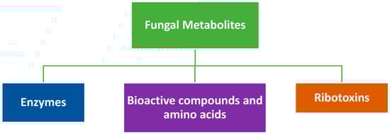 Fungi produce both primary and secondary metabolites of medical and economic significance. Pertinent to the review are three major types of metabolites (see Figure 2): the enzymes, bioactive compounds (including amino acids), and fungal ribotoxins. Although it is estimated that at least 5.1 million species of fungi exist, the Basidiomycota and Ascomycota phyla appear to have predominance and include several wood- and litter-decomposing fungi []. Moreover, these two phyla have thus far produced the most impactful metabolites, including enzymes that have gained industrial importance. They have shown demonstrable application in carbon recycling and therefore bioremediation, as well as usefulness in food, feed, and pharmaceutical industries [,,,,]. The enzymes produced by fungi are unique because of their broad substrate specificity as well as their strong oxidative and hydrolytic abilities, and of utmost importance is the ease of collection since most of them are expressed extracellularly. Table 1 shows some important examples of industrially relevant fungal enzymes and the aspects of industry in which they have found application. Several authors in recent times have reviewed the applications of these enzymes [,,].