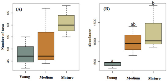 Number of taxa (A) and total abundance (B) of macrofungal species collected from young, medium-aged, and mature Pinus radiata stands in Menagesha Suba, central Showa, Oromia National Regional State, Ethiopia. Boxplot data showing the max and min values. The bar in the box is the standard deviation of the mean. Values with the same letter are not significantly different.