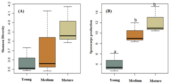 Shannon’s H′ diversity (A) and total sporocarp production (kg ha−1) (B) of macrofungal species collected from young, medium-aged, and mature Pinus radiata stands in Menagesha Suba, central Showa, Oromia National Regional State, Ethiopia. Boxplot data showing the max and min values. The bar in the box is the standard deviation of the mean. Values with the same letter are not significantly different.