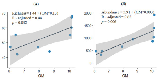 Additionally, a linear model of the different explanatory variables indicated that the entire macrofungal richness and abundance were significantly predicted by OM (p < 0.05; Figure 5). Regressing OM against richness and abundance yielded the equations in Figure 5A and Figure 5B, respectively. In both cases, the model fits the data well and OM explained 44% and 62% of the variation in fungal richness and abundance, respectively. The sign of the coefficient was positive for both, which indicates that as OM increases, richness and abundance also increase. Thus, the average richness and abundance would increase for every 1 unit increase in OM in the studied plantation stands.