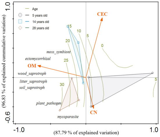 Canonical correspondence analysis ordination plot based on abundance data of functional fungal groups observed in young (5 years old), medium-aged (14 years old), and mature (28 years old) Pinus radiata stands in Menagesha Suba, central Showa, Oromia National Regional State, Ethiopia. Plots depicted in the same color are in the same stand. Edaphic variables are shown in orange. The percentage of cumulative explained variation by each axis is shown. Isolines indicate the stand age values (R2 = 0.78).