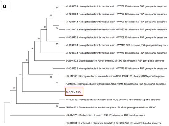 Figure 1. Neighbor-Joining tree of the sequencing result based after BLAST analysis. (a) Bacterial isolate’s 16S rRNA sequence; (b) yeast isolate’s 26S rRNA sequence with closely identical sequences and several distant species. The tree was reconstructed using 500 bootstrapping. Red box (a) 13.7.KBC.HSA indicates the bacterial isolate and (b) 13.7.KBC.HSF indicates yeast isolate from the Kombucha culture.