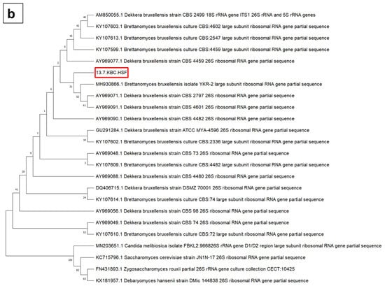 The most dominant yeast isolated (13.7.KBC.HSF) was identified through the D1/D2 region of the 26S rRNA gene sequencing and was shown to have 99.83% similarity with the sequence of Brettanomyces/Dekkera bruxellensis (Figure 1b). D. bruxellensis is one of the yeast species that is commonly found in Kombucha [,] and other fermented products, such as beer [], wine [], cider [], and kefir []. This yeast has a complex phenotypic, genotypic, and population structure, which can vary based on the substrate, isolation origin, and geographical origin, suggesting the anthropic influence of the species’ diversity []. D. bruxellensis has been considered industrially important due to its high resistance to osmotic and ethanol stress, the ability to grow in oxygen-limited environments, and low pH. It also demonstrates the ability to produce biofilm with characteristics known to be strain-dependent []. The genetic sequence analysis of different D. bruxellensis strains reveals that they are equipped with a gene cluster comprising of a nitrate transporter, nitrate reductase, nitrite reductase, and two Zn(II)2 Cys6 type transcription factors that enable the utilization of nitrate as a sole nitrogen source [,,]. Such a cluster might allow the yeast to thrive in low-nitrogen environments like molasses. D. bruxellensis is also capable of utilizing sucrose efficiently due to the expression of a high-efficiency sucrose transporter, which allows D. bruxellensis to outcompete Saccharomyces cerevisiae in sucrose-based fermentations [,].