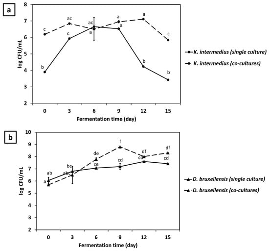 Figure 2. The growth of (a) K. intermedius and (b) D. bruxellensis as single and co-culture. Culture conditions: media composition, 150 g/L molasses, 500 mg/L caffeine, acetate buffer (200 mM, pH 4.75); inoculum size, 10% v/v; K. intermedius: D. bruxellensis ratio, 1:1; temperature, 30 °C. Means with different letters are significantly different (p < 0.05).