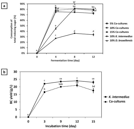 Figure 3. (a) Reducing sugar consumption by single and co-culture varying in inoculum sizes (5%, 10%, 15% v/v); (b) BC yield and (c) pH changes during single and co-culture fermentation using inoculum size of 10% v/v. Culture conditions: media composition, 150 g/L molasses, 500 mg/L caffeine, acetate buffer (200 mM, pH 4.75); K. intermedius: D. bruxellensis ratio, 1:1; temperature, 30 °C. Means with different letters are significantly different (p < 0.05).
