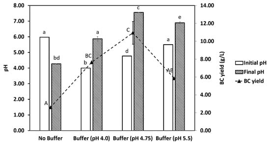 Figure 4. Effects of acetate buffer on pH and BC yield after 7 days of co-culture fermentation. Culture conditions: media composition, 150 g/L molasses, 500 mg/L caffeine, acetate buffer (no acetate buffer; 200 mM, pH 4.0, 4.75, 5.5); inoculum size, 10% v/v; K. intermedius: D. bruxellensis ratio, 1:1; temperature, 30 °C. Different upper-case letters indicate significant differences (p < 0.05) in BC yields.