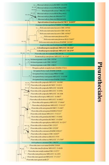 Savoryellomycetidae currently accommodates four orders, Conioscyphales, Fuscosporellales, Pleurotheciales and Savoryellales. This is based on evidence from phylogenetic analyses and divergence time studies with the order having a stem age estimated as 268 MYA [1]. The four orders clustered as a robust clade in all studies [1,2,3]. Pleurotheciales, with a single-family Pleurotheciaceae [4], is the largest order in Savoryellomycetidae. Pleurotheciaceae species have mostly been isolated from decaying wood or plant debris as saprobes, while few species were also identified as opportunistic human pathogens (Phaeoisaria clematidis) [5]. Multi-locus phylogenetic relationships of Pleurotheciaceae species were investigated to better understand their taxonomy [3,4,6,7,8,9,10] and as a result, eleven genera were accepted in the family [11].