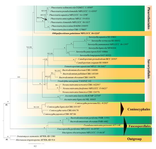 RAxML tree of Savoryellomycetidae with four orders, Conioscyphales, Fuscosporellales, Pleurotheciales and Savoryellales. The multi-locus tree is generated from combined LSU, SSU, ITS and rpb2 sequence data. Bootstrap support values for maximum likelihood (the first value) equal to or greater than 60% and Bayesian posterior probabilities (the second value) equal to or greater than 0.95 are placed near the branches as ML BS/BI PP. The asterisk “*” represents bootstrap support values with 100% ML BS and 1.00 BI PP. The tree is rooted to Doratomyces stemonitis AFTOL-ID 1380 and Microascus trigonosporus AFTOL-ID 914. The ex-type cultures are indicated using “T” after strain numbers and the new species introduced in this study are indicated in bold.