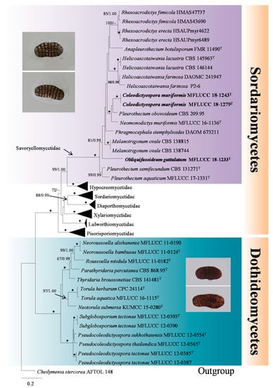 In the second multi-locus phylogenetic analysis (Figure 2), a total of seven subclasses (Diaporthomycetidae, Hypocreomycetidae, Lulworthiomycetidae, Pisorisporiomycetidae, Savoryellomycetidae, Sordariomycetidae and Xylariomycetidae) in Sordariomycetes, as well as Pseudocoleodictyospora and its relatives in Dothideomycetes were included in the dataset, representing 55 isolates and one outgroup taxon (Cheilymenia stercorea AFTOL 148). The matrix had 2068 distinct alignment patterns, with 45.12% of completely undetermined characters and gaps. In the RAxML tree, Coleodictyospora was phylogenetically distant from Pseudocoleodictyospora, although their morphology was quite similar [29]. The relationships of Obliquifusoideum were weak with four orders in Savoryellomycetidae (Figure 1), but it was shown to be a genus in Savoryellomycetidae with strong bootstrap support.