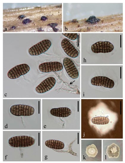 Notes: Coleodictyospora muriformis belongs in Coleodictyospora based on the punctiform, sporodochial colonies on the natural substrate, monoblastic conidiogenous cells, and cylindro-ellipsoidal, muriform conidia produced perpendicularly to the conidiophores and with a hyaline, semi-gelatinous sheath [30,31]. Coleodictyospora muriformis is easily distinguished from the type species C. cubensis by its shorter conidiophores (up to 55 μm long vs. 70–85 μm long), smaller conidia (32–44 × 15.5–19 μm vs. 42–50 × 20–22 μm) and fewer conidial transverse septa ((7–)8–9 vs. 8–14). The transverse septa of the conidia of C. muriformis are filled with dark brown bands, while they were neither described nor illustrated in C. cubensis [30,31,33,42]. Coleodictyospora muriformis has overlapping conidial dimensions with C. micronesiaca, but it differs in having long, branched conidiophores (up to 55 μm long) and longer conidiogenous cells (7.5–20 × 2.5–3.5 μm), and the conidiophores attach to the middle of the conidia. In contrast, C. micronesiaca lacks conidiophores and the conidiogenous cells are shorter (2–8 × 3–4 μm), which directly ascend from the basal mat of sporodochia; the conidiogenous cells often attach to the end of the conidia. In addition, the conidiogenous cells in C. micronesiaca are mostly short subulate, while they are long cylindrical in C. muriformis. We therefore introduce C. muriformis as new to the genus. A morphological comparison of Coleodictyospora species is summarized in Table 2 and a combined figure plate of three species is illustrated in Figure 4.
