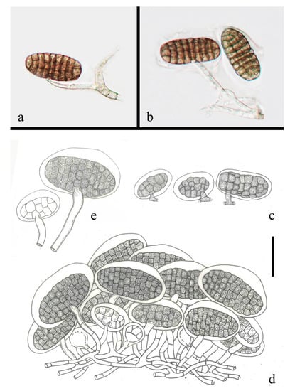 Coleodictyospora spp. (a,b from MFLU 18-1544, holotype. c–e redrawn from Matsushima [31] and Seifert et al. [42]). (a,b) C. muriformis (conidia with branched conidiophores); (c) C. micronesica (conidia growing on a short subulate conidiogenous cell which directly ascends from the basal mat of sporodochia); (d,e) C. cubensis (d sporodochia bearing a mass of conidia. e conidia with a long conidiogenous cell). Scale bars, (a–e) 30 μm.