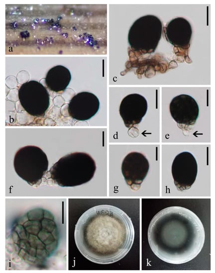 Saprodesmium dematiosporum (HKAS 101710, holotype). (a) sporodochia with a mass of conidia and scattered conidia on natural substrate; (b) conidia and conidiophores; (c) conidia attach on pseudoparenchyma of sporodochia; (d,e) conidia with conidiogenous cells (arrows); (i) conidial surface showing muriform patttern; (j,k) colony on PDA (left-front, right-reverse). Scale bars, (b–e,h) 15 μm; (f,g,i) 10 μm.