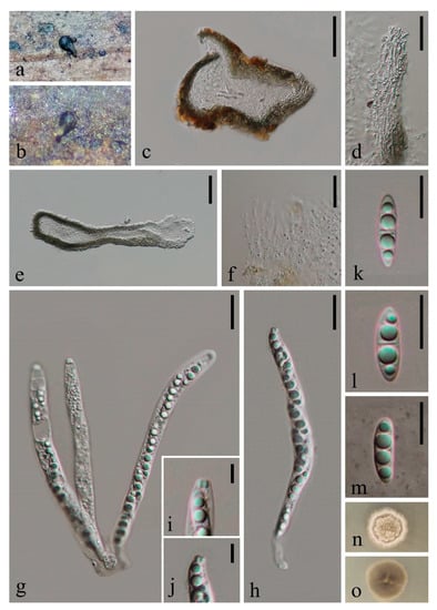 - Doilom, M.; Dissanayake, A.J.; Wanasinghe, D.; Boonmee, S.; Liu, J.-K.; Bhat, D.J.; Taylor, J.E.; Bahkali, A.H.; McKenzie, E.H.C.; Hyde, K.D. Microfungi on Tectona grandis (teak) in Northern Thailand. Fungal Divers. 2017, 82, 107–182. [Google Scholar] [CrossRef]