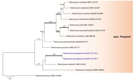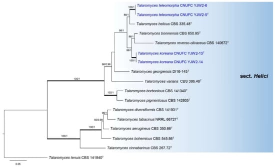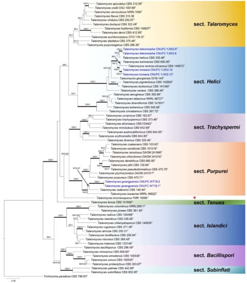 The genus Talaromyces was established by Benjamin (1955) [1] for a teleomorph of Penicillium with Talaromyces vermiculatus (=T. flavus) as the type species. These species are characterized by cleistothecial or gymnothecial ascomata, unitunicate eight-spored asci, and unicellular ascospores with or without equatorial crests. The anamorphs have predominantly biverticillate or rarely terverticillate conidiophores with acerose phialides and narrow collulum [2,3]. In 2011, Samson et al. [2] transferred all accepted species of Penicillium subgen. Biverticillium to Talaromyces on the basis of a two-gene phylogeny. Subsequently, Yilmaz et al. [3] studied the taxonomy of Talaromyces in detail using the polyphasic species concept. On the basis of multigene phylogeny, morphology, and physiology, Yilmaz et al. [3] placed 88 accepted species in seven well-defined sections, namely, Bacillispori, Helici, Islandici, Purpurei, Subinflati, Talaromyces, and Trachyspermi. However, the lists are rapidly increasing with many new Talaromyces species recently described from all over the world and added to sections Helici, Islandici, Purpurei, Subinflati, Talaromyces, and Trachyspermi [4,5,6,7,8,9,10,11,12,13,14,15,16,17,18,19,20,21,22,23,24,25,26,27]. To date, 171 species have been reported in the genus Talaromyces [27], of which only three species: Talaromyces angelicae, Talaromyces cnidii, and Talaromyces halophytorum were reported from Korea [28,29]. Recently, a new section Tenues was proposed [26]. Talaromyces contains species that play an important role in agriculture and biotechnology. Talaromyces rugulosus (Basionym: Penicillum rugulosum) produces β-rutinosidase and phosphatase [30,31], T. pinophilus (Basionym: Penicillium pinophilum) produces endoglucanase and cellulase [32], and T. funiculosus (Basionym: Penicillium funiculosum) produces cellulases [33]. Talaromyces purpureogenus can produce extracellular enzymes and red pigment and also produces mycotoxin such as rubratoxin A and B and luteoskyrin [34]. Additionally, red pigments produced in large amounts by T. atroroseus can be used as colorants in the food industry [35]. Furthermore, the ability to produce various important compounds makes them candidates for the biocontrol of soilborne fungal pathogens such as an antagonists of T. flavus against Verticillium spp., Rhizoctonia solani, and Sclerotinia sclerotiorum [36,37,38,39,40]. In addition, some species are medically important, such as T. wortmannii, which can produce compound C that was found to be an effective antimicrobial against Propionibacterium acnes and had anti-inflammatory properties and, thus, represents alternative treatments for antibiotic or anti-inflammatory therapy for acne [41]. Talaromyces marneffei (Basionym: Penicillium marneffei) causes a fatal mycosis in immunocompromised individuals [42,43].