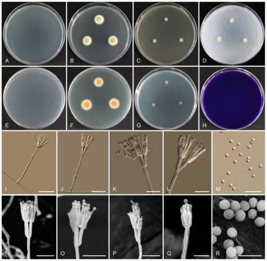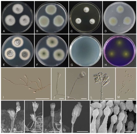 Morphology of Talaromyces gwangjuensis CNUFC WT19-1. (A,E) Colonies on Czapeck yeast autolysate agar (CYA). (B,F) Malt extract agar (MEA). (C) Yeast extract sucrose agar (YES). (D) Oatmeal agar (OA). (G) Dichloran 18% glycerol agar (DG 18). (H) Creatine sucrose agar (CREA). ((A–D,G,H) Obverse view and (E,F) reverse view). (I–L,N–Q) Conidiophores. (M,R) Conidia. ((I–M) LM and (N–R) SEM). Scale bars: (I–M) = 20 μm, (N–Q) = 10 μm, and (R) = 5 μm.