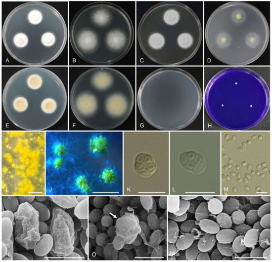 - Crous, P.W.; Cowan, D.A.; Maggs-Kölling, G.; Yilmaz, N.; Larsson, E.; Angelini, C.; Brandrud, T.E.; Dearnaley, J.D.; Dima, B.; Dovana, F.; et al. Fungal Planet description sheets: 1112–1181. Persoonia 2020, 45, 251–409. [Google Scholar] [CrossRef] [PubMed]