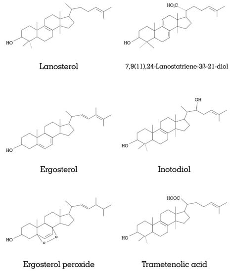 Cancer is one of the leading causes of death worldwide. The uncontrolled growth of cells can characterize as cancer and may be present in blood and body parts. Mushrooms have been reported to control the cell division, and, used in cancer therapy [71], such as the chaga mushroom (Inonotus obliquus), possess anti-cancerous compounds [72,73]. The main chemical constituents include lanosterol, 7,9(11),24-lanostatriene-3β-21-diol, ergosterol, inotodiol, ergosterol peroxide, and trametenolic acid (mentioned in Figure 1); they showed anticancer activity counter to the prostatic carcinoma cell lines PC3 and breast cancer cell line MDA-MB-231. The compounds that showed IC50 values against PC3 were calculated to be 9.82 ± 0.98 µg/mL for ergosterol, 38.19 ± 1.67 µg/mL for ergosterol peroxide, 63.71 ± 3.31 µg/mL for trametenolic acid, and 73.46 ± 0.64 µg/mL for 7,9(11),24-lanostatriene-3β-21-diol. However, inotodiol and lanosterol were non-efficient with IC50 values above 100 µg/mL, while Nakata et al. successfully isolated the inonotsuoxides A, inotodiol, trametenolic acid, and lanosterol from the same mushrooms and showed anti-tumor activity in vivo [74]. Park and his coworkers reported the isolation of proteins from the Cordyceps militaris (CMP). The isolated proteins showed trypsin-like serine protease activity. The protein could inhibit F. oxysporum and cytotoxicity towards the human breast and bladder cancer cells [75]. Kosanic et al. studied the effect of metal concentration on anticancer activity of Lactarius deliciosus and Macrolepiota procera [76]. The anticancer activity was determined on the HeLa cells, human lung carcinoma A545 cells, and human colon carcinoma LS174 cells. The study showed that the M. procera showed comprehensively better anticancer effects on the A549 and LS174 cell lines, while the HeLa cell lines were more prone to Lactarius deliciosus. Similarly, Kim et al. isolated the hetero polysaccharides from the L. deliciosus with anticancer activity [77].