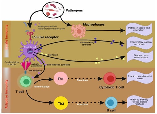 The immune system is a combination of specialized cells and protein networks that protects the body against infection. The level of immunity decides how healthy a person is. The active part of mushrooms acts along with the human body’s immune system and fights against diseases. The mushroom acts via modulating the innate and adaptive immune system (Figure 2). The host pattern recognition receptors and pathogen-associated molecular patterns decide the response after invasion by foreign bodies. The pattern recognition receptors activate the innate immunity after pathogen recognition, while Toll-like receptors activate the pathways coordinating with the innate immunity and trigger the immunity response [114].
