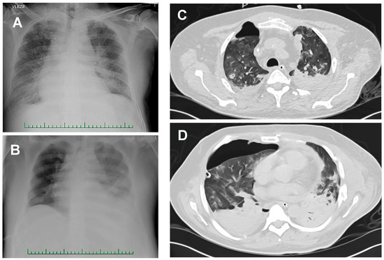 Patient 1 (man, age 65), with cirrhosis and multiorgan dysfunction (serum creatinine 950 μmol/L), was transferred from a medical inpatient unit to an ICU owing to sepsis (C-reactive protein 211 mg/L, procalcitonin 99.8 ng/mL). He required mechanical lung ventilation, vasopressors, and continual venovenous hemodialysis. He was treated with cefotaxime because of repeated aerobic hemocultures positive for E. coli. Hemolytic E. coli was also present in the urine, but susceptible to antibacterial therapy (Eucast v10, https://eucast.org, accessed on 15 December 2020). Due to diarrhea episodes, the patient was given metronidazole empirically. When acute respiratory failure (ARF) developed, the patient was intubated, connected to a ventilatory support system, and continuously dialyzed. Chest radiography showed increasing bilateral, inhomogeneous blurring, believed to be caused by inflammatory infiltrations (Figure 1A,B).