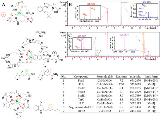 Noninvasive detection of Aspergillus and Pseudomonas biomarkers returned by CycloBranch. (A) Chemical structures of the siderophores (1–6) and HHQ (9). Compound numbering is described in the associated table. (B) Patient 1’s urine profile compiled from reconstructed ion chromatograms recorded in the low- and high-mass experiments (see Materials and Methods for details). TafC was detected as a singly charged species (m/z 906.3304, see the right inset for Peak 6, indicating the presence of 54Fe and 56Fe stable isotopes). The left inset (Peak 1) indicates the isotopic profile of FoxE. (C) Patient 1’s breath condensate profile sampled on the same Day 12 of illness with a mixture of doubly charged pyoverdines. Peak 5 in the left inset is represented by an isotopic pattern, indicating two charges (54Fe/56Fe isotopes are separated by approximately one Dalton). The right inset belongs to pyochelin singly protonated molecule. M in the table stands for neutral molecule; Ret. time, retention time. Fluconazole and its glucuronide structures are reported in Supplementary Materials Figure S8.