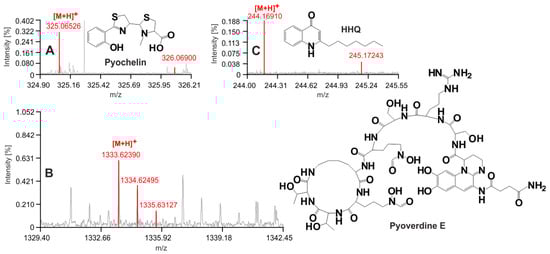 MALDI-FTICR-MS annotation of Patient 1’s breath condensate (sampled Day 12). Pch (A), PvdE (B), and HHQ (C) were all detected by MALDI MS as protonated forms. The structures of these molecules are shown. The annotation in red was returned by CycloBranch software [9] when running the MALDI mass spectrum against the library of P. aeruginosa secondary metabolites. The red color was added to an examined spectrum by the software automatically. The color indicates which isotope features have been used by the computing algorithm for the annotation process.