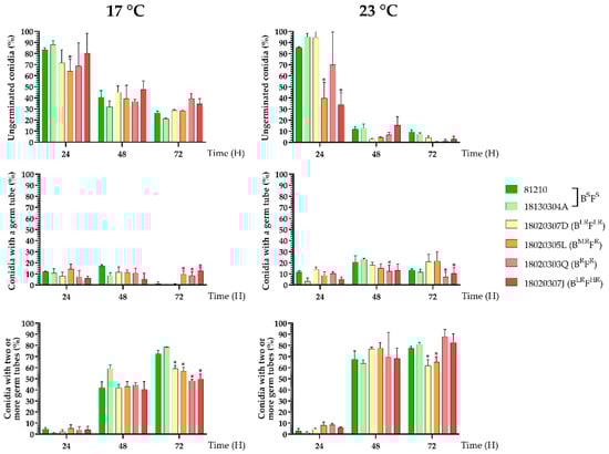 For conidial germination, the number of ungerminated spores, germinated spores with a single germ tube, and spores with two or more germ tubes were observed for each isolate (Figure 2). In general, there were no differences between the SDHI-resistant isolates and the sensitive isolates, and the few significant differences did not follow any phenotypic pattern. For the ungerminated conidia, the number was higher at 24 h, and it was reduced at 48 h and 72 h, especially at 23 °C. The number of conidia with a germ tube remained below 20% three times, increasing slightly at 48 and 72 h at 23 °C. During this stage, and at 17 °C, three of the SDHI-resistant isolates (18020305L, 18020303Q and 18020307J) had significantly higher values, at approximately 10% cotyledon coverage, than the sensitive isolates (1% or less) at 72 h. Lastly, the percentage of conidia with two or more germ tubes, which are those that will normally develop haustoria and complete infection, increased notably at 48 and 72 h at both temperatures. At 17 °C, all the SDHI-resistant isolates had a percentage of spores with two or more germ tubes that was significantly lower than that of the sensitive isolates (78–72% for the sensitives versus 59–48% for the resistant ones), which was in contrast with the results of the spores with one germ tube at the same temperature after 72 h (Figure 2).