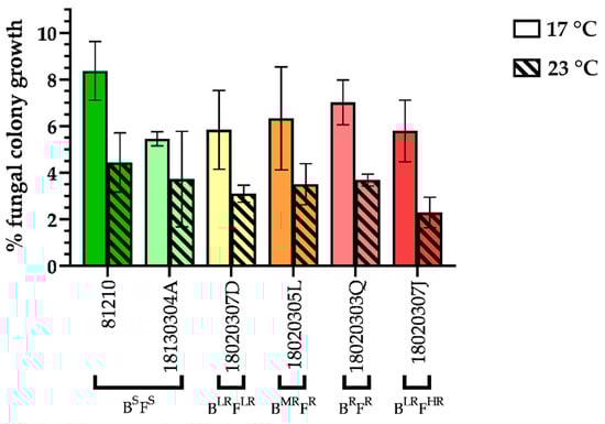 Percentage of fungal colony growth, starting from a single spore and covering the surface of a zucchini cotyledon. P. xanthii isolates with different SDHI phenotypes (sensitive (S) and low resistance (LR), moderate resistance (MR), resistant (R) and high resistance (HR) to boscalid (B) or fluopyram (F)) were incubated at 17 °C and 23 °C for 15 and 30 days, respectively.