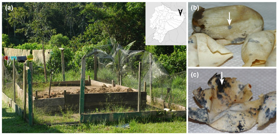 Sampling location at Yasuní National Park (Ecuador) and eggshells of P. unifilis with macroscopic signs of Fusarium infection (colored spots). The hatcheries were located in the territories of Guiyero, Nueva Providencia and Sani Isla Communities (distributed along the Napo and Tiputini rivers). (a) Artificial hatchery located at Guiyero; (b) eggshells showing early symptoms of fusariosis (indicated with an arrow); (c) eggshells with advanced symptoms (arrow).