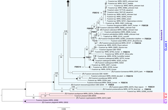 All 17 FSSC isolates were linked to a species reference sequence (i.e., generated from type material). Specifically, 14 isolates clustered in the Subclade C along with the type strain F. keratoplasticum FRC S-2477 and additional specimens of this species. Sister to the Subclade A with no support (PP = 0.70, BS = 14%), we found a clade formed by 145 FUS, 152 FUS, F. suttonianum NRRL 32858 (type material), and other representatives of this species (PP = 1, BS = 99%).