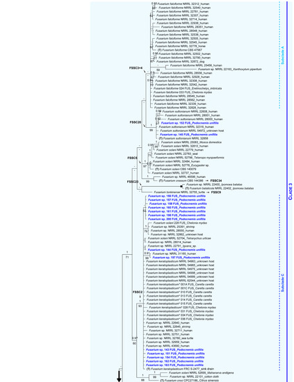 - Geiser, D.M.; Al-Hatmi, A.; Aoki, T.; Arie, T.; Balmas, V.; Barnes, I.; Bergstrom, G.C.; Bhattacharyya, M.K.K.; Blomquist, C.L.; Bowden, R.; et al. Phylogenomic analysis of a 55.1 kb 19-gene dataset resolves a monophyletic Fusarium that includes the Fusarium solani species complex. Phytopathology 2020. [Google Scholar] [CrossRef]