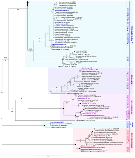 Finally, within the Bacteroidetes clade (PP = 1, BS = 100%), the isolates B25 and B27 were part of two robust clades constituted by members of the genera Chryseobacterium (PP = 1, BS = 94%) and Elizabethkingia (PP = 1, BS = 100%), respectively.