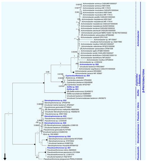Within the Beta-Proteobacteria clade, the isolate B26 and all representatives of the genus Achromobacter analyzed here, including the type (A. xylosoxidans), constituted a group only supported in the Bayesian analysis (PP = 1, BS = 33%). A fully supported multispecies group (PP = 1, BS = 100%) comprised the isolate B20, the type of the genus Cupriavidus, and one member of Ralstonia. Sister with full support to both mentioned assemblages, we found another highly supported monophyletic group (PP = 1, BS = 100%). This was formed by B24, B31, two species of the genus Delftia (including the type, D. acidovorans), and two unidentified specimens. Additionally, within Beta-Proteobacteria, B28, B30, B32 and B33 formed an unsupported group with several species of the genus Pseudomonas, a single representative of Vibrio, and the type of Stenotrophomonas (S. maltophilia, recovered as polyphyletic). Closely related to this unsupported group, we found a small robust clade constituted by the isolate B21 and several species of Pseudoxanthomonas (PP = 1, BS = 100%).