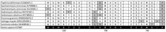Figure 1. Alignment of conservative DPP4 fragments close to active site in representatives of various subdivisions of higher fungi in relation to human DPP4. Substitutions found in fungi are grayed out, the amino acid residues of DPP4 Homo sapiens are highlighted in black, the conservative amino acid triad is highlighted in bold. Amino acid residue numbers are given for DPP4 H. sapiens.